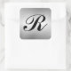 Prata escovada com placa metálica padrão cromada com vista à superfície com adesivos de fundo e selos impressos. Personalize facilmente com qualquer inicial monograma, nome ou texto próprio. Excelente para qualquer casamento ou talvez um favor de festa de aniversário para seus convidados. Ou exclua este plano de fundo e adicione sua própria foto ou imagem. O popular autocolante quadrado é mostrado.