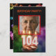 Adicione uma imagem para personalizar este convite de festas único.Um convite de aniversário 104º divertido com números de velas felizes queimando em um cupcake de chocolate. Certifique-se de mudar o nome no verso para o nome do aniversariante ou garota. Veja toda a gama de convites e cartões na minha loja.