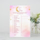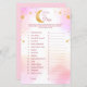 Folha de chá de fraldas rosa divertida com o tema "Sobre a Lua". Apresentando o clássico jogo de chá de fraldas "Adivinha o Preço". Um jogo fácil e divertido para os convidados jogarem no chá de fraldas. Você pode editar ou personalizar as instruções e a lista de produtos.