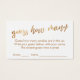 Estes cartões sutis são adequados para bebês e chás de panela. Usando uma moderna fonte manuscrita, criei uma camada gráfica que dizia "adivinha quantos". Foi embelezado com um efeito falso de folha de ouro. Abaixo estão as instruções para o jogo e outro campo para os palpites e nomes dos jogadores de jogos. As costas ficaram vazios. O fundo destas placas é branco editável; sinta-se livre para mudar isso para uma cor diferente, se preferir. // 100 // Concebida por Melody Watson para Paper Muserie.