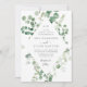 Um design de casamento verde com uma estrutura geométrica e lindas folhas verdes de eucalipto, Você pode mudar o texto, tamanho do texto, cor e fonte neste convite de casamento.