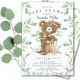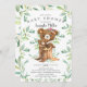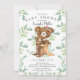 Chá de fraldas bonito, com um doce bebê urso, com a mãe sentada num toco de árvore e enquadrada com folhas naturais verdes de aquarela, sobre fundo branco. Sacudir nosso convite para ver uma folha verde correspondente para um toque especial extra.