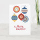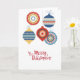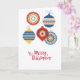 Cartão de Natal com Adornos Escandinavos em fundo branco, e letra Merry Christmas em vermelho