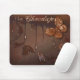 O "Yummy mousepad" apresenta uma rica aresta de derretimento de chocolate sobre um fundo castanho profundo de folhas de chocolate e borboleta. O texto diz que eu adoro chocolate.