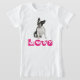 Esta camiseta canina divertida mostra uma imagem de um cachorro-do-ouro francês preto e branco com amor impresso em uma fonte de cor rosa-forte.