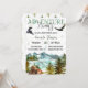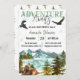 Convite brilhante com a natureza selvagem, lago, floresta, montanhas, aves e urso.