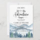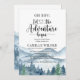 Que a aventura comece o convite para chás de fraldas de aquarelas com florestas e montanhas paisagem selvagem com tipografia de escrita de caligrafia com coração no meio.