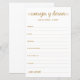 Estas folhas simples, douradas, modernas, mínimas, escritas à mão, Conselhos e Desejos Espanhóis/Consejos y Deseos são perfeitas para ter chá de panela, janto de ensaio ou convidados de casamento preenchidos para o casal feliz. As pessoas vão adorar ter as ordens - tornam tão fácil deixar palavras amáveis de conselhos e de bons desejos. Eles ficarão tesos por anos.