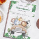 Animais da selva e folhas de palma verdes, convite de aniversário mínimo de crianças — animações bonitinhas, ilustração aquarela com fundo branco e tipografia personalizável em preto e verde.