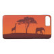 O fundo africano de safari, com silhuetas de uma girafa, uma árvore e um elefante contra o pôr do sol em tons laranja e vermelhos.