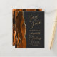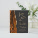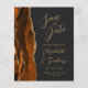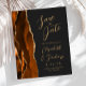 A borda esquerda deste elegante casamento moderno salve o cartão de data apresenta uma borda agitada de cor laranja queimada, aparada com falsa brilho dourado. O texto personalizável combina manuscritos dourados, copperplate e fontes itálicas em um fundo escuro. O verso apresenta uma design de cor laranja queimada e dourada.