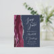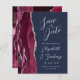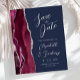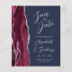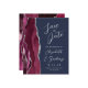 A borda esquerda deste elegante casamento moderno salve o cartão de data apresenta uma borda vermelha e borrifada de cor-d-água, aparada com falso brilho prateado. O texto personalizável combina a escrita manual de cinzas prateadas, fontes copperplate e itálico em um fundo azul marinho. O lado inverso apresenta um design de burgundy e agate prateado.