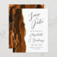 A borda esquerda deste elegante casamento moderno salve o cartão de data apresenta uma borda agitada de cor laranja queimada, aparada com falsa brilho dourado. O texto personalizável combina a escrita manual de cinzas de carvão, as fontes em copperplate e itálico em um fundo branco. O verso apresenta uma design de cor laranja queimada e dourada.
