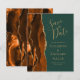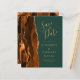 A borda esquerda deste elegante casamento moderno salve o cartão de data apresenta uma laranja queimada e uma aquarela ferrugem borda cortada com falsa brilho dourado. O texto personalizável combina manuscritos dourados, placas de impressão e fontes itálicas em um fundo verde esmeralda. O verso apresenta uma design de cor laranja queimada e dourada.