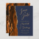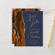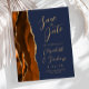 A borda esquerda deste elegante casamento moderno salve o cartão de data apresenta uma borda agitada de cor laranja queimada, aparada com falsa brilho dourado. O texto personalizável combina manuscrito dourado, fontes em copperplate e itálico em um fundo azul marinho. O verso apresenta uma design de cor laranja queimada e dourada.