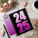 College and Business 2024 2025 Personal Customizable Planner (Planejador Pessoal Personalizável para o College and Business 2024 2025). A frente preta tem os números 24/25 em negrito com uma cor rosa vibrante. A tampa traseira tem a mesma coloração rosa que na parte frontal e um design com carimbos com nome, título e texto personalizáveis. Este é um planejador que você pode usar durante dois anos como um semestre. O dentro inclui páginas semanais e mensais e uma página adesiva a ser usada em todo o planejador. 12 meses de espaço de planeamento mensal e semanal aberto. Você preenche as datas. Um planejador para usar na Escola e na Faculdade, assim como para empresas profissionais.
