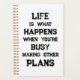 "A vida é o que acontece quando você está ocupado Fazer outros planos" citação motivacional engraçada. Um lembrete potente de que podemos criar todo o tipo de objetivos e ambições para o futuro, mas, quando temos uma orientação forte para o futuro, podemos esquecer de viver plenamente entretanto.