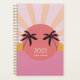 Novo planejador de 2022 com design colorido, sol, palmeira. Personalizado com nome, iniciais, aspas, mensagem para um presente da sua própria organização. Simples estilo rosa e amarelo, para uma mulher, adolescente, jovem adulto, para escola, trabalho, escritório.