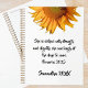 Este planejador anual de verso Bíblia personalizado mostra uma foto de girassol com as palavras do Provérbio 31:25 abaixo para a flor e um nome e ano personalizáveis sob o verso Bíblia. As palavras são fáceis de personalizar mudando para seu verso Bíblia ou citação motivacional favoritos. Proverbs 31:25 fala sobre como a mulher cristã ideal está confortável em sua vida agora, digna sem preocupações, e preparada para o que o futuro traz. "Ela é vestida com força e dignidade, pode rir-se dos dias vindouros. Provérbios 31:25"