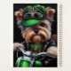 Um amigo peludo atrás das guiadas de uma bicicleta verde brilhante, vestindo uma roupa verde para o Dia de São Patrick que faz as cabeças virarem. O cachorro está vestido num conjunto festivo, completo com uma gravata verde de arco e um chapéu de topo correspondente que se senta suavemente sobre a cabeça. A roupa apresenta designs intrincadas de shamrocks e duendes, fazer claro que este cão está pronto para celebrar o Dia de São Patrício no estilo.