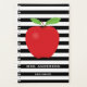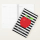 Este planejador apresenta um design para um professor. O fundo é um padrão de riscas horizontais preto-e-branco tendencioso com uma ilustração digital de uma maçã vermelha. O texto personalizado permite adicionar o nome e a nota do professor.