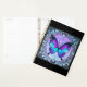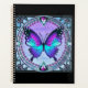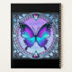 Uma borboleta vibrante com tons de azul e roxo é centrada dentro de um design circular ornamentado, cercada por intrincados padrões florais e joias decorativas. A composição total expele uma estética de vidro manchado com uma mistura harmoniosa de cores e simetria.