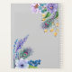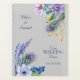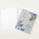 Este planejador de casamento apresenta buquês florais modernos em cores predominantes de azul e violeta no canto superior direito e inferior esquerdo. Os buquês diferem um do outro, mas são semelhantes. O topo tem toques de ouro pálido. Cada uma delas inclui uma pena de pavão colorido estilo boho. As imagens florais são colocadas sobre um fundo de cinza prateada, com seu texto personalizado em cinzas azuis em quatro campos laterais. A parte de trás do notebook tem as imagens florais, mas nenhum texto. Certifique-se de ver os produtos correspondentes em nossa loja.