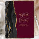 Este elegante planejador de casamento moderno apresenta uma design de aquarela preta, aparada com falsa brilho dourado. Personalize facilmente o texto dourado em fundo burgundy, com os nomes da noiva e do noivo em caligrafia manuscrita sobre um grande e grande painel. Adicione o título e a data do casamento em itálico. O cobrir traseiro apresenta um design de agate preto e dourado correspondente.