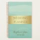 Simples, elegante planejador de casamento verde de menta-d'água com detalhes de folhas de ouro amarelas e nomes de casais, para noivas modernas.
