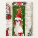 Cavalier King Dog sentado do lado de fora de casa decorada com coroa de Natal, árvore de Natal é uma ideia perfeita de presente de Natal para amantes de cachorros.