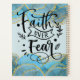 Design personalizável para um presente inspiracional personalizado com uma citação "Fé sobre o Medo", na tipografia moderna com letras manuais, com um efeito semelhante a um abstrato, feito com tinta alcoólica em azul, cinza e cores douradas.