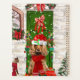 Cachorro Cachorro Espanhol sentado do lado de fora da casa decorada com coroa de Natal, árvore de Natal é uma ideia perfeita de presente de Natal para amantes de cachorros.