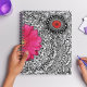 Um belo planejador com padrões de arte desenhada à mão e flores rosa e vermelhas brilhantes.