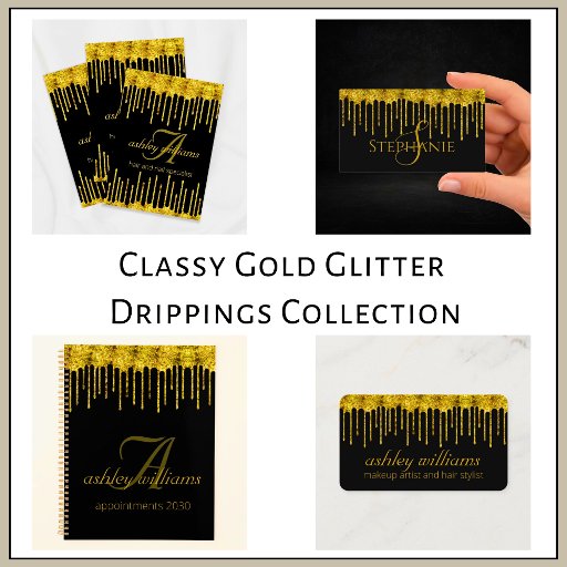 Notebook monograma de ano/mês/semana de trabalho, dourado e preto, para cabelos e estilos de maquilhagem, com gotas de ouro luxo e um fundo preto moderno. Você pode alterar a fonte/cor.