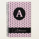 Design apresenta um fundo cor-de-rosa para um padrão polka-dot preto. Frente exibe a inicial que você fornece em letras cor-de-rosa contra um oval preto. A parte inferior exibe o nome ou texto em um script cor-de-rosa contra uma faixa preta. O dorso é preto sólido.