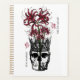 um crânio e uma tigela de coroa com lírios vermelhos dentro, com a citação, a vida é a bela mentira, a morte é a verdade feia