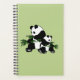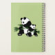Panda mama senta-se comendo bambu enquanto o bebê faz como o bebê panda vê