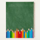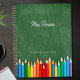 Um planejador personalizado moderno para professores com um fundo de quadro verde com lápis coloridos coloridos. Nome do professor em Script. Texto personalizado na parte inferior de uma fonte de serifa.