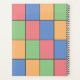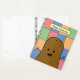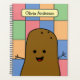 Diário de estilo de pop-art colorido divertido com um padrão de verificação de retângulos coloridos diferentes na frente e na parte traseira do planejador. A frente no topo é uma modelo para adicionar seu nome ou outro texto para personalizar. Abaixo da modelo está uma feliz batata marrom de desenho animado com pequenos pontos para os olhos, braços colados para fora de cada lado do corpo e um grande sorriso feliz.
