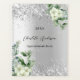 Fundo de aspecto fino prateado decorado com flores brancas, flores, verde eucalipto e brilho falso prateado, faíscas. Personalizar e um ano, nome e título/texto