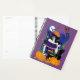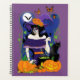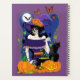 Uma bruxa vestida de púrpura e laranja com o dia do crânio de açúcar da maquiagem morta. Gato negro, abóboras de caldeirão e uma lua de cheio atrás deles.