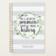 Nosso planejador de motivação quic mostra a citação "mulheres bem comportadas raramente fazem história" em um roteiro de pincel mantilado rodeado por uma coroa botânica em azul e verde em um fundo listrado de cinza neutra. Personalize com o ano e seu nome, ou sua escolha de personalização.
