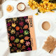 Um bonito padrão botânico para aqueles que amam a queda com folhas de outono desenhadas à mão em castanhos, amarelos e verdes sobre fundo preto. Personalize o ano e a data!