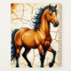 A bold illustration of a majestic golden horse with a flowing black mane set against a cracked cream and gold background, conveying strength, freedom, elegance and dynamic movement for decorative or editorial use.