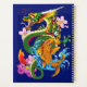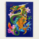 Um dragão chinês verde com um peixe koi laranja com flores de lótus e flores de cereja contra um pano de fundo de azul escuro.