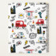 ,A playful, cartoon-style city pattern featuring buses, cars, helicopters, traffic lights, buildings, and fun doodle text like “Beep Beep,” “Wuz Up?” and “Go,” in bright red, yellow, blue, and black tones.