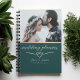 Planeje seu dia de sonho em estilo com este elegante caderno de casamento verde e esmeralda. Possui uma foto personalizada no topo, um roteiro de caligrafia dourada e um design de coração romântico entrelaçado. Personalize com os nomes e a data do casamento. Perfeito para organizar cada detalhe — de listas de convidados a cronogramas — em uma única manutenção de eterno.