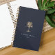 O planejador personalizado do chic apresenta duas linhas de texto personalizado em letras brancas clássicas, em um rico fundo azul marinho adornado com uma ilustração de palmeiras tropicais em folha de ouro falsa. Personalize com seu nome e ano, ou com sua escolha de texto personalizado.