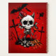 Mágica de abóbora e diversão óssea. Em meio a um cenário sombrio de cemitério, um esqueleto animado fica preso em uma pilha de pedras intactas. O esqueleto, com seus membros ósseos e sorriso malicioso, veste um arco vermelho em greve ao redor do pescoço e apontou chifres diabólicos que lhe dão uma expressão lúdica, mas maliciosa. Na sua mão direita, ele segura orgulhosamente uma lanterna em forma de abóbora brilhante sobre um palito longo, cuja luz quente irradia suavemente para os arredores. O fundo da design é um vermelho vibrante que enfatiza o espírito festivo do Halloween.