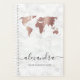 Design de planificador de na moda que apresenta um mapa mundial de rosa de cobre faux elegante, fundo de mármore branco e letra elegante de caligrafia. Personalize o produto com seu nome e detalhes.
